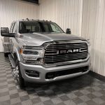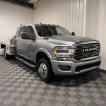 This 2023 Ram 3500 Laramie Crew Cab DRW 4WD is a heavy-duty flatbed truck built for serious towing and work-site capability while still delivering premium everyday comfort. Finished in Billet Silver Metallic Clearcoat, it’s equipped with a standout 9’ DuraMag aluminum flatbed with gooseneck hitch, giving it the durability and functionality buyers want in a true work-ready setup. Dual rear wheels, tow hooks, LED lighting, and Laramie trim details complete the bold, professional look.