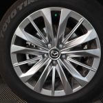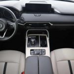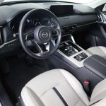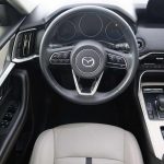 The upscale cabin indulges with heated front bucket seats, power driver and passenger adjustments, leather-wrapped steering wheel and shift knob with mounted audio controls, tri-zone automatic climate control including rear air, heads-up display, Mazda Connected Services with voice command, infotainment supporting AppLink/Apple CarPlay/Android Auto, Pandora integration, and an 8-speaker AM/FM sound system.